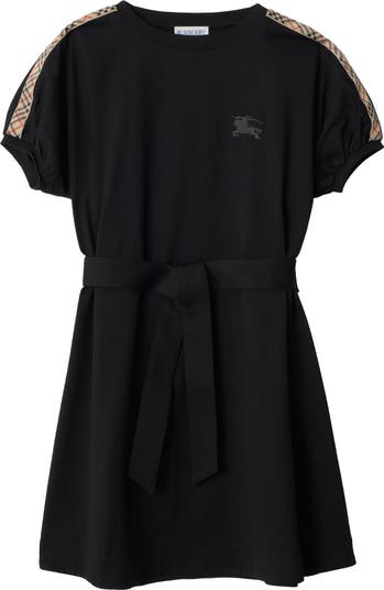 A T-shirt dress in cotton jersey, trimmed with Burberry Check at the sleeves. The design features an embroidered Equestrian Knight Design and a belt that can be tied into a bow.||Self-tie belt|Embroidered Equestrian Knight Design at chest