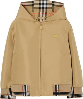 A Harrington jacket reimagined with a protective hood, perfect for unpredictable weather. Fully lined in soft cotton, the design features the Burberry Check in signature sand beige at the interior, cuffs and hem.||Zip closure|Side welt pockets|Rib-knit trims|Embroidered Equestrian Knight Design at chest|Burberry Check lining