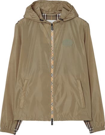 A hooded jacket woven in nylon, detailed with the Burberry Check at the arms and placket. The lightweight style is cut to a relaxed fit and appliquéd with our Knight stamp – an archival motif first seen on Burberry bags in the 1980s.