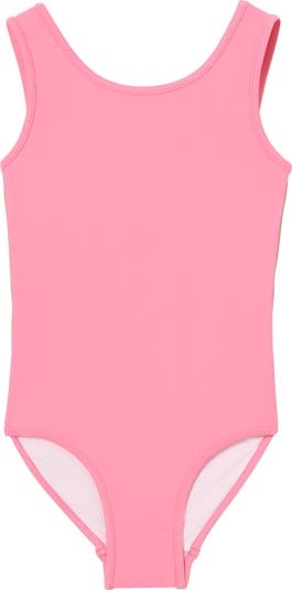 A floss-pink swimsuit in stretch nylon, trimmed with the Burberry Check in our classic archive beige colourway.