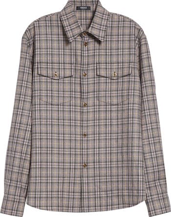 Versace opulence and rugged Americana collide in this checked Italian-wool flannel button-up shirt glitzed up with gilded Medusa-head hardware—a nod to the molded door of the maison's first headquarters.