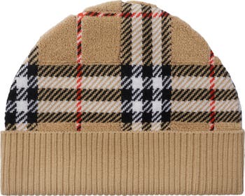 A Burberry Check beanie knitted from soft wool towelling in our signature sand beige colourway.||Rib-knit trims