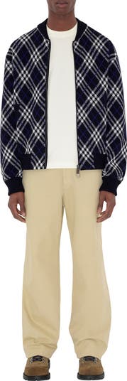 A bomber jacket made from a lightweight wool blend, jacquard-knitted with the Burberry Check in a seasonal ink colourway. The style is cut to a regular fit and features B-cut zip pulls.||Two-way zip closure|Side welt pockets|Rib-knit trims|Comes with a garment bag