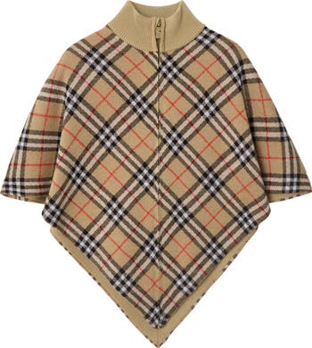 A cape knitted with our Burberry Check in soft wool towelling. The design is finished with a rib-knit stand collar and a B-cut zip pull.||Front zip and side press-stud closure