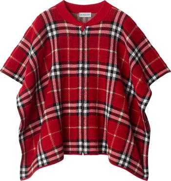 A cape knitted with our Burberry Check in soft wool towelling. The design is finished with a rib-knit collar and B-cut zip pull.||Front zip and side press-stud closure