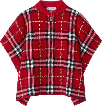 A cape knitted with our Burberry Check in soft wool towelling. The design is finished with a rib-knit collar and B-cut zip pull.||Front zip and side press-stud closure