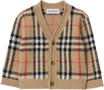A cardigan in wool cashmere, knitted with the Burberry Check in signature sand beige. The V-neck design is finished with rolled, rib-knit trims.||Button closure|Rolled, rib-knit trims