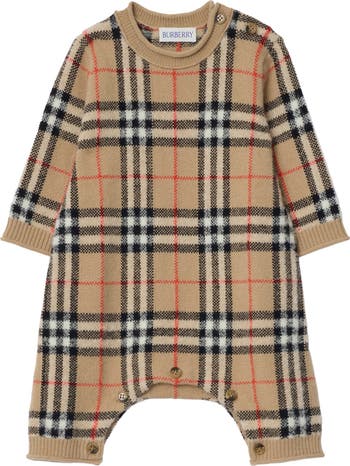 A jumpsuit in wool cashmere, knitted with the Burberry Check in signature sand beige. The cosy design is finished with rolled, rib-knit trims.||Buttoned shoulders and gusset|Rolled, rib-knit trims