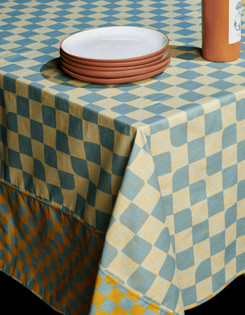 Bring timeless and playful patterns to your table with our reversible tablecloths, ideal for everyday meals and special occasions. The Checker Sky brings a soft curve into a geometric pattern which vibrates in classic yellow, light blue, and cream. Each tablecloth features a unique design with a central panel and two side panels in complementary palettes and rich colors. Made from 100% Japanese cotton shantung with a lightly textured weave. Available in 2 sizes.