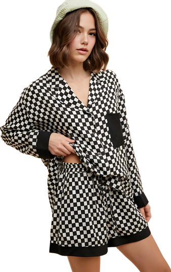 The Knit & Lounge checkerboard print set delivers a playful yet effortlessly cool vibe. Featuring a relaxed button-up shirt with a solid black pocket and matching cuffed shorts, this set is perfect for making a bold, chic statement while staying comfortable.