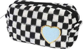 This charming cosmetic bag features a classic checkered pattern with a playful patch. Compact and lightweight, it’s perfect for storing makeup and small essentials, with a zip-top closure for secure and easy access.