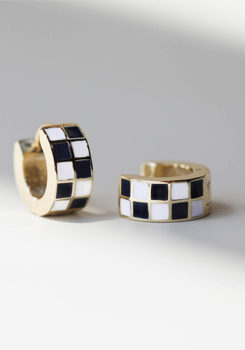 The checkered enamel huggies are a wide, small gold hoop with enamel that fits closely to the ear. They feature a hinge closure for comfort and wearability.