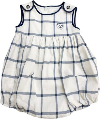 Your baby boy will look stylish in this checkered linen romper. Made of premium linen for breathability temperature control. Great for everyday wear. Checkered linen romper in ivory and navy color with satin trim and logo embroidery. Nautical decorative buttons. Fully lined. Snap bottom closure.