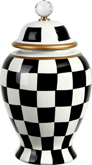 The Mark Roberts checkered urn with lid stands 15 inches tall and features a classic pattern that adds visual interest and timeless charm. Crafted for both beauty and function, the fitted lid provides a secure and polished finish. Its elegant design makes it a versatile decorative accent for shelves, mantels, or tabletops.