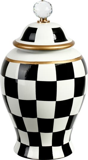 Mark Roberts checkered urn with lid stands 13 inches tall and features a classic pattern that adds visual interest and timeless charm. Crafted for both beauty and function, the fitted lid provides a secure and polished finish. Its elegant design makes it a versatile decorative accent for shelves, mantels, or tabletops.