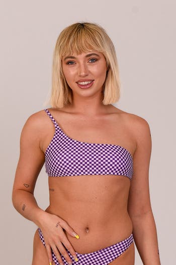 Our Cold Shoulder Bikini Top features a one shoulder asymmetric style with an adjustable strap and tie up back for a fun, playful holiday look. Mix and match this bikini top with any of our range of bikini bottoms; Mile High, Tie Up Sides, Brazilian or V-Cut to switch up your look. Make sure you look fresh from the beaches to the ski resort hot tubs this season with the funky purple checkerboard print on the OOSC Checkmate Cold Shoulder Bikini Top. We also have the matching men's shorts for those matchy matchy poolside moments & epic couple shots for the gram! Features: