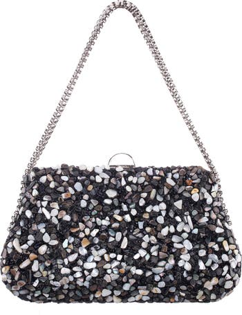 Vibrant stone embellishments add a pop of color to a sophisticated clutch that can be carried by the top handle or the chain crossbody strap.