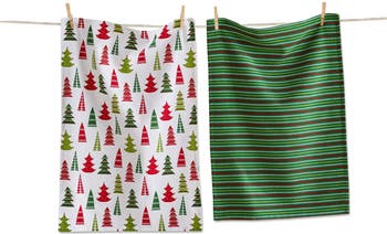 A festive and cheerful dishtowel set featuring two delightful designs: one with green and red stripes and the other with cute Christmas trees. Perfect for holiday gatherings and everyday use.