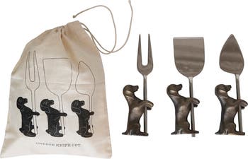 These cheese serving knives have adorable dog stands to hold them upright when not in use. Place on each corner of the serving tray along with the cheeses. Include this set of knives with your hors d'oeuvres at your next get together. The knives come in a set of 3 with a printed drawstring bag.