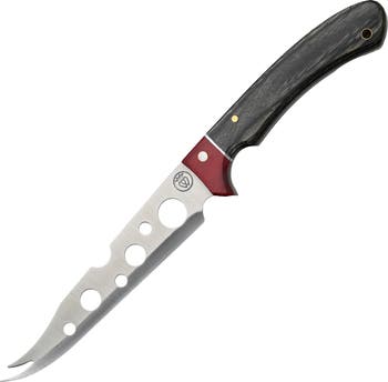 Prince of Scots Premium Cheese-Tomato Knife is precision crafted to be the best knife for charcuterie or making sandwiches. Suitable for home or professional use. Carefully crafted with a 420 stainless steel blade, the knife features an ergonomic pakkawood handle. Beautiful and Functional! The perfect knife for sandwiches and charcuterie. This versatile knife has an open blade, featuring our artistic Swiss cheese design, that prevents food from sticking and a pronged tip for spearing, Ideal for slicing and serving cheese, slicing tomatoes, and even bread. The Serrated edge that cuts through tomatoes with ease. A small, thin beveled blade is designed to cut easily through soft or hard textures. The serrated blade has cutouts that reduce sticking, and a speared tip for serving. This knife makes a beautiful and useful addition to cheese and hors d'oeuvres plates. The Cheese-Tomato Knife is well equipped with an extra-large handle for skilled foodies entertaining skills. The blade is strong enough to cut hard cheese, soft cheese, and sticky food products like pastries, pies, eggs, tomatoes, and fruits. The Multi purpose design makes slicing, spreading, and spearing cheese a breeze. Presented in Beautiful Gift Box! Premium Cheese-Tomato Knife: Measures 10.85 Inches Long, 5 inch handle, 5.85 inch blade, 420 Steel Blade, Brass Rivets, and Pakkawood Handle. Beautiful and Functional featuring Prince of Scots Logo as a seal of approval. Razor Sharp: The blade is strong enough to cut hard cheese, soft cheese, tomatoes, breadn and sticky food products like pastries, pies, eggs, tomatoes, and fruits. Designed for lasting durability. Spear Tip & Cutter Tool: The Multipurpose design makes slicing, cutting, and spearing cheese a breeze. Quad-Tang Handle: Exceptionally weighted and balanced. Extra Large 5-inch ergonomic pakkawood handle. Washing Instructions: Handwash only for best results. Keep the knife clean, dry, oiled, and sharp