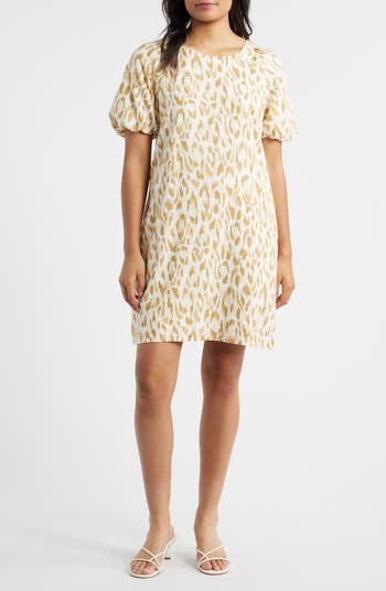 Cheetah Cove Puff Sleeve Linen Blend Shift Dress
