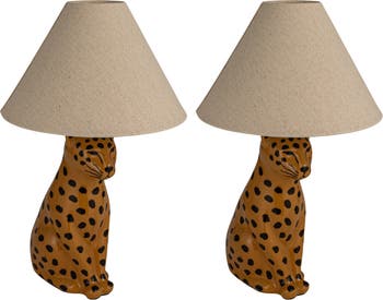 This set of two Round Ceramic Cheetah Table Lamps brings a touch of the wild into the home with their vibrant yellow and black cheetah design. Perfect for eclectic, novelty, cottagecore, and cabin interiors, these lamps add a playful yet sophisticated element to any space. It requires one standard bulb per lamp and features an inline switch for convenient use. Made of durable porcelain and linen, these lamps ensure durability and style. It measures 12 inches in diameter and 21 inches in height, making it a striking addition to the home decor. The unique cheetah design of these lamps will surely make a statement in any room, adding a pop of personality to any decor. Whether placed on bedside tables, desks, or side tables, these lamps will catch the eye and spark conversation among guests.