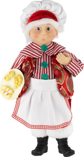 This adorable elf chef figure will add a dash of whimsical charm to your holiday décor! This delightful elf is dressed in a festive red and white striped outfit, complete with a shimmering vest adorned with shiny sequins and a crisp white apron. With a platter of delicious treats in hand, this merry elf is ready to serve up some holiday cheer at your Christmas feast. Bring joy and culinary magic to your home this season with this enchanting figure! Product Features: Chef Elf Christmas figure This charming figure is dressed in a striped outfit with velour red pants and a white apron Accented with shimmering sequin vest The elf holds a platter brimming with delicious bakery treats Moving arms and weighted bottom for stability The perfect gift for cooks, bakers, or elf figure collectors Recommended for indoor decorative use only Dimensions: 12"H x 6.5"W x 4.5"D Material(s): plastic/fabric/faux fur/sequins