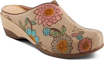 Hand-painted flowers bring whimsical artistry to a comfortable clog crafted with a perforated leather upper and grounded by a chunky heel.