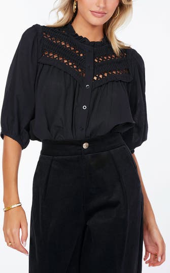 The Chelsea Blouse is made from airy cotton, featuring lace detailing at the high neckline with delicate ruffles. Complete with front button closure and puffed sleeves that exudes Soft romance.