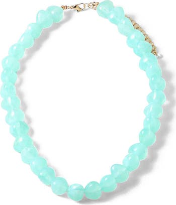 This vibrant strand features smooth, rounded beads in the dreamiest shade of aqua — somewhere between sea glass and soft turquoise. The glossy finish gives it a modern feel, while the simple silhouette keeps it wearable and chic. It’s the necklace that instantly makes a white tee look styled.