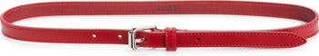 Smooth calfskin with a subtle luster gives this slim belt a clean, polished line. A logo-engraved buckle adds a quiet flash of metal and the edges are neatly painted with measured stitching built to last.