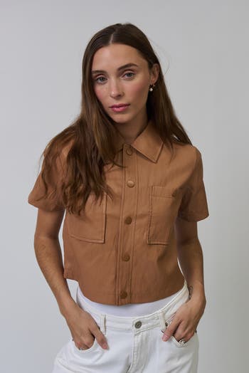 This short sleeve top showcases a structured cropped silhouette with a smooth faux leather finish, featuring a classic collar, front pockets, and a soft lining for comfortable, modern everyday wear.