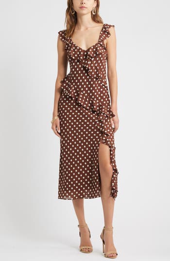 Cascading ruffle trim adds an extra dimension of retro appeal to this brightly patterned midi dress complete with a flirty side slit.