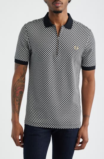 A bold checkerboard motif energizes this modern polo styled with a quarter-zip placket. Contrast trim at the spread collar and cuffs sharpens the look, while an embroidered laurel wreath logo at the chest delivers a signature finish.
