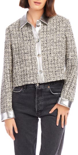 Metallic faux-leather trim brings high-shine elevation to this cropped jacket crafted from tactile tweed.