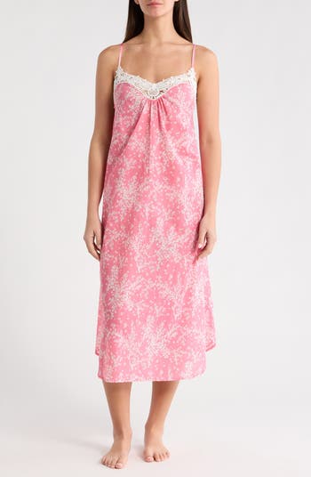 Soft lace trims the neckline of this flowy nightgown cut from lightweight, breathable cotton with a romantic cherry-blossom print.