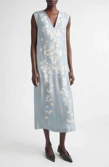 A brushstroke print that evokes the beauty of falling cherry blossom petals brings ethereal whimsy to this silk midi dress cut in a relaxed V-neck silhouette.