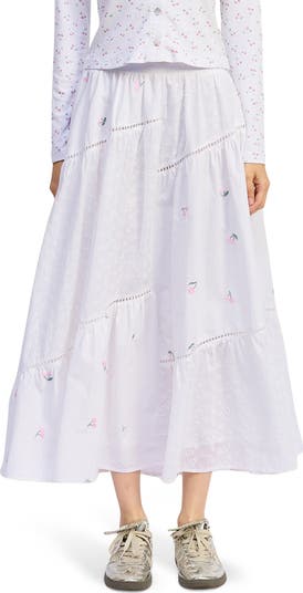 Sweet with a touch of nostalgia, this tiered midi skirt is cut from breathable cotton and pieced together in a charming patchwork of airy eyelet lace and cherry-embroidered poplin. The softly gathered tiers create movement and dimension, while the mix of textures feels playful.