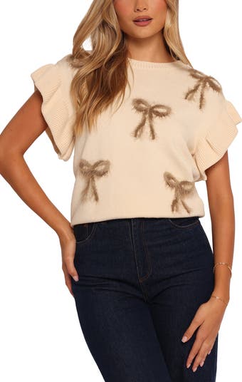 Fuzzy intarsia bows with a hint of metallic sparkle texture a charming lightweight sweater framed by ruffled sleeves.