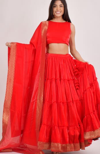 The Cherrie Red Tiered Shimmer Lehenga Choli Set radiates romance with its all-red design. The shimmer tiered lehenga features a silk jacquard border, while the matching silk blouse with a boat neckline and jacquard details adds timeless elegance. The silk dupatta, also featuring jacquard border, completes this stunning red tiered lehenga choli set.