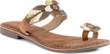 Tiny beads create a flowery work of art on a breezy toe-ring sandal.