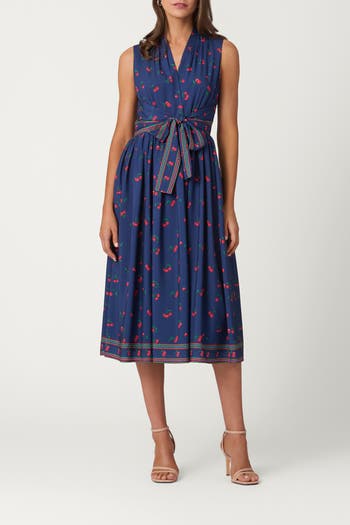 Gorgeous midi dress in printed crepe de chine fabric. This style features a V-neckline with subtle draping around the neck. The waist tie features the combo cherry print border; it can be crossed around the front and tied at the back, or it can be tied at the front waist in a bow for a feminine look. The bodice is lined and the skirt is unlined. Center back invisible zip closure.