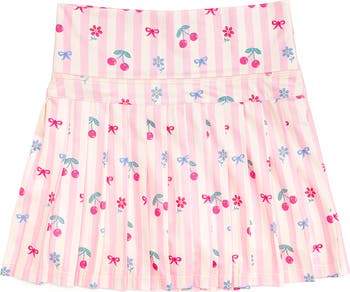 This playful skort features soft pink stripes sprinkled with cherries and bows, blending sporty comfort with the sweetest twirl-worthy style.