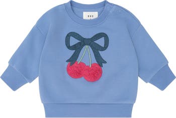 Her soon-to-be new favourite drop shoulder sweatshirt It's made from cloud-like organic cotton fleece in a blue hue and features a cherry bow embroidery on the tummy.