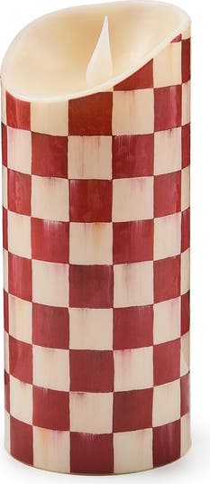 Add ambiance to every setting with this flameless pillar candle decorated with the brand's signature check pattern. This candle has a wax exterior with a plastic center and casts a flameless glow created with two AAA batteries that can be controlled by the included remote.