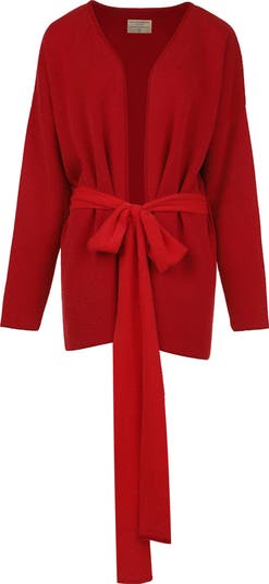 Effortlessly chic, this open-front cardigan in a rich red hue is crafted from a soft, mid-weight knit that drapes beautifully over the body. Designed with a relaxed silhouette and a matching self-tie belt to cinch the waist, it offers both comfort and structure. Perfect for layering over dresses or tailoring, this piece brings understated sophistication to any look.