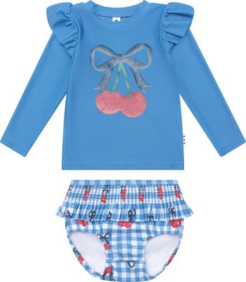 Our Cherry Gingham 2PC Swim Set is rated UPF 50+, which is the highest achievable sun protective rating for fabrics and consciously crafted with recycled polyester. Features long sleeves for added protection and leg/sleeve frills, just for fun. Baby sizes come with nappy lined bottom (up to size 2).