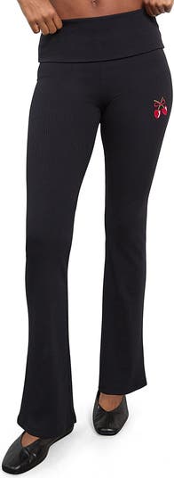 Go from couch to street in these soft cotton-blend ribbed pants shaped with a deep fold-over waistband and slightly flared leg. Embroidered cherries at the hip add a sweet touch.