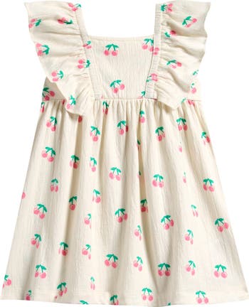 Dual ruffles perfectly frame your little one in this airy crinkled-jersey dress bursting with cherry-sweet charm.