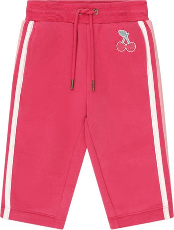 Va va voom. This cherry red trackpant is their new favourite pair of pants. Made from our 100% organic cotton, they features an adjustable drawstring, stretchy waistband, cherry embroidery, and racer stripes down the sides for extra speed. Bar tacked at back.